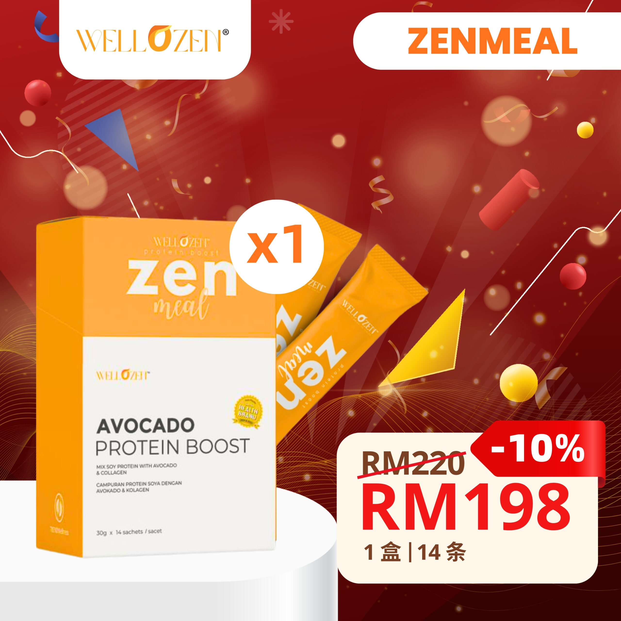 Perfect for first-timers or light users, the Starter Pack gives you a full 2-week supply. One sachet of ZenMeal contains high plant-based protein equivalent to 4 whole eggs protein. Each sachet is packed with mix nutrients such as soy protein to support muscle recovery, collagen for skin health, and avocado for natural good fats. Instant, portable & delicious—just add water and shake! Zen Meal keeps you full, supports lean muscle recovery, and is gentle on digestion. Get it now at ONLY RM198! *Limited time offer!